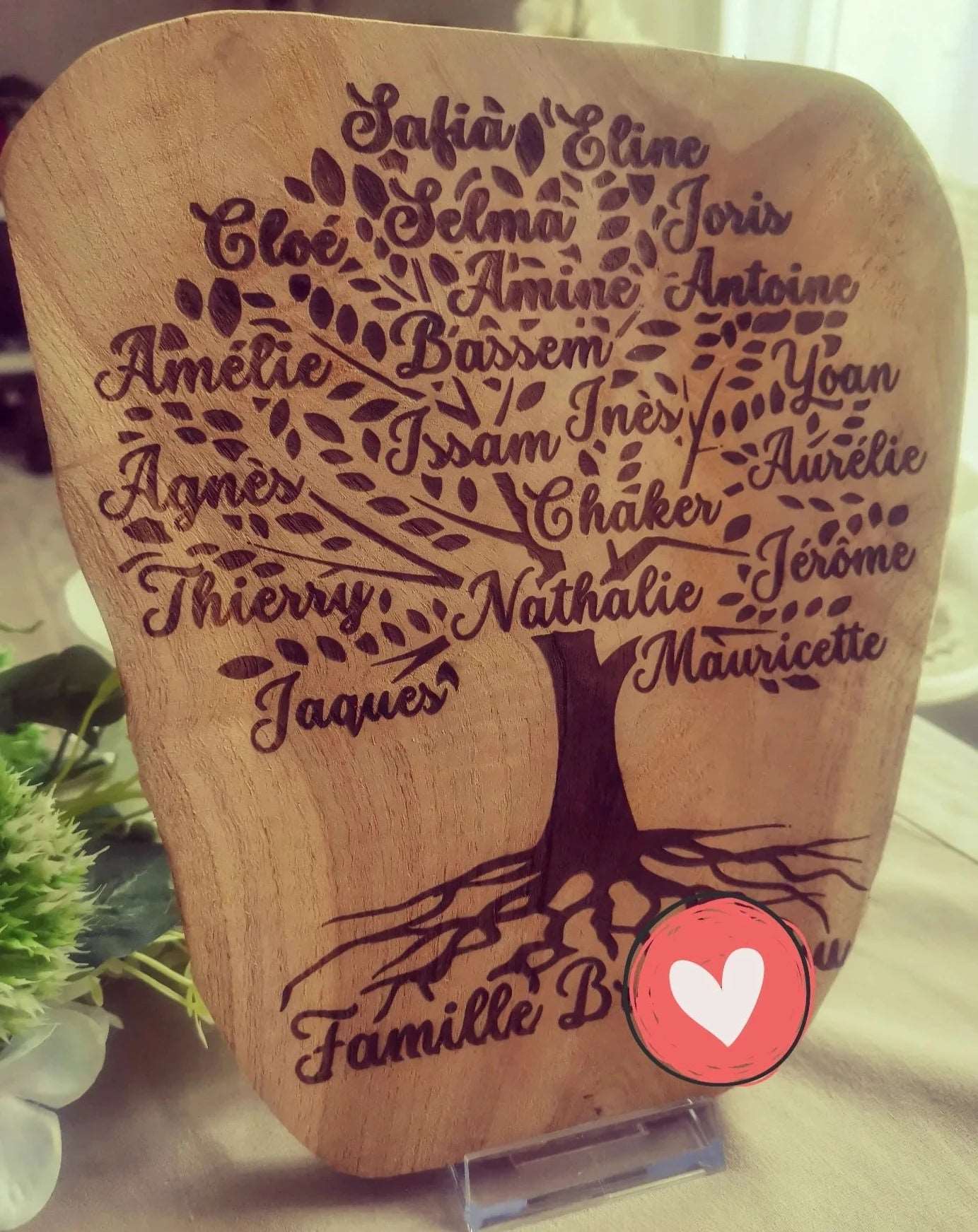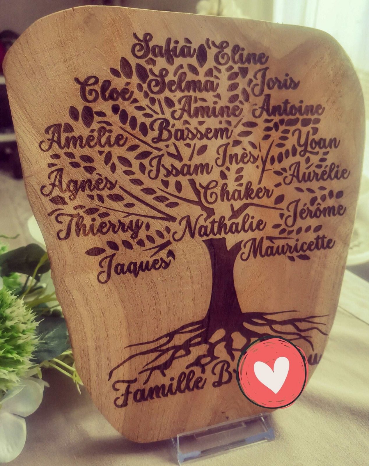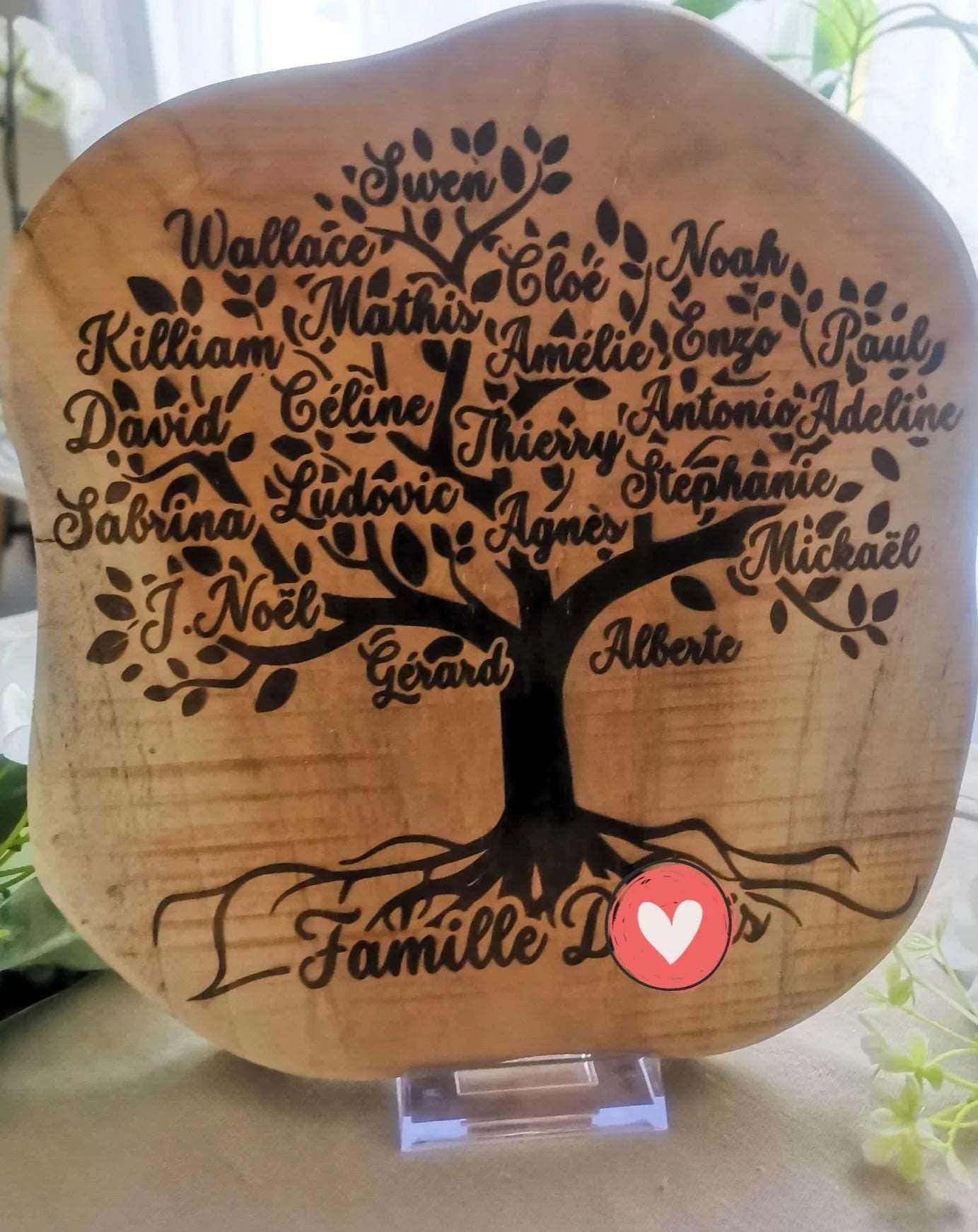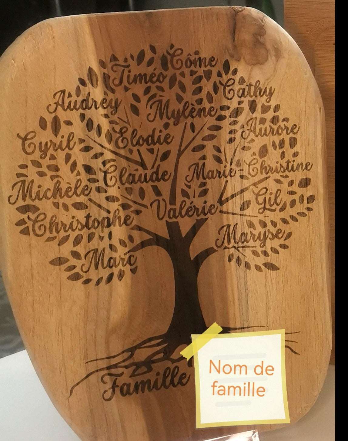 Chaque branche de l’arbre est minutieusement gravée au laser avec les prénoms de chaque membre de la famille dans l’ordre des générations, les plus anciens en bas, et nous remontons avec les plus jeunes en haut de l’arbre. Dans vos instructions, merci de classer les prénoms par générations : grands parents, parents, enfants.