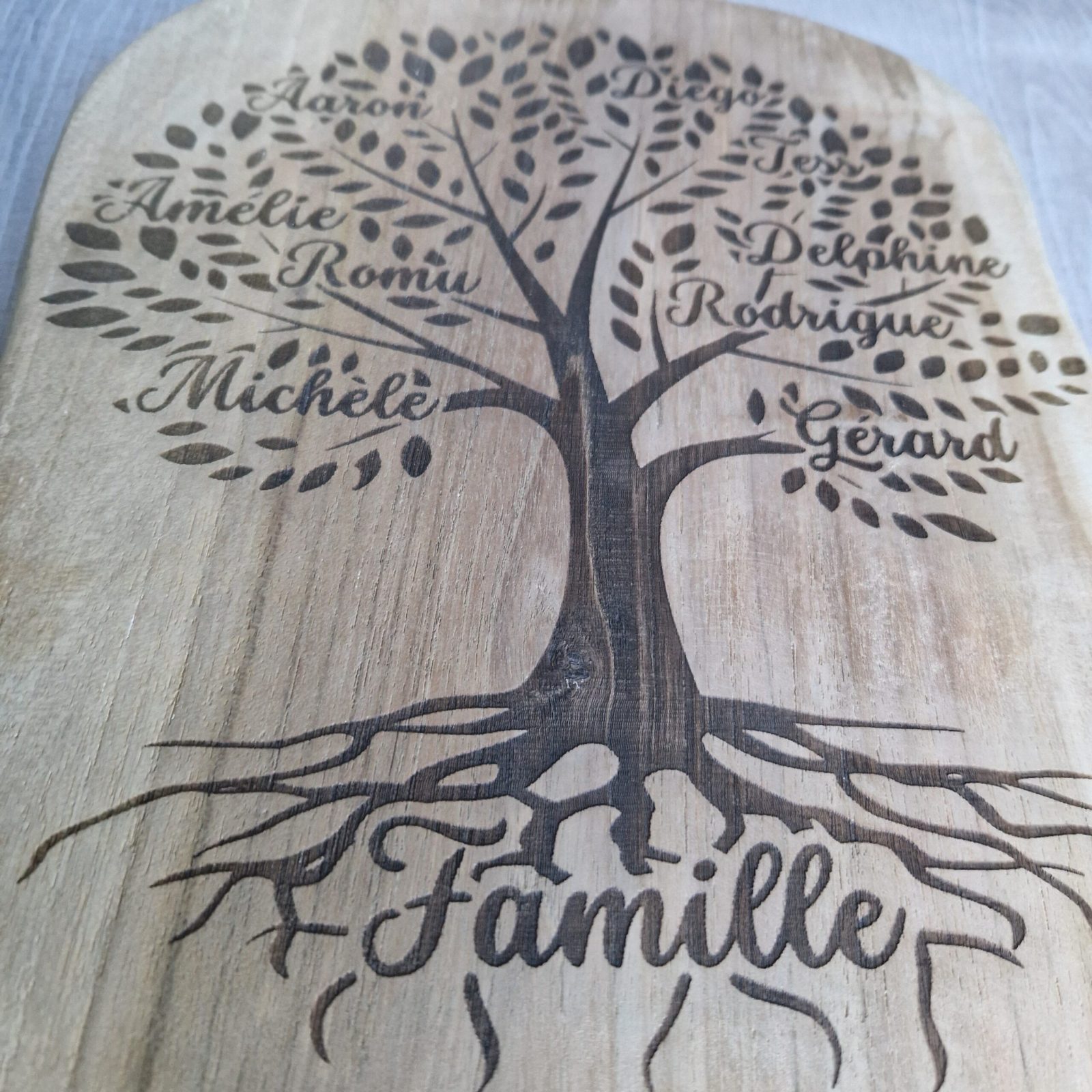 Offrez un cadeau unique avec cet arbre généalogique gravé sur une planche en bois naturel, personnalisé pour capturer l’histoire de votre famille.