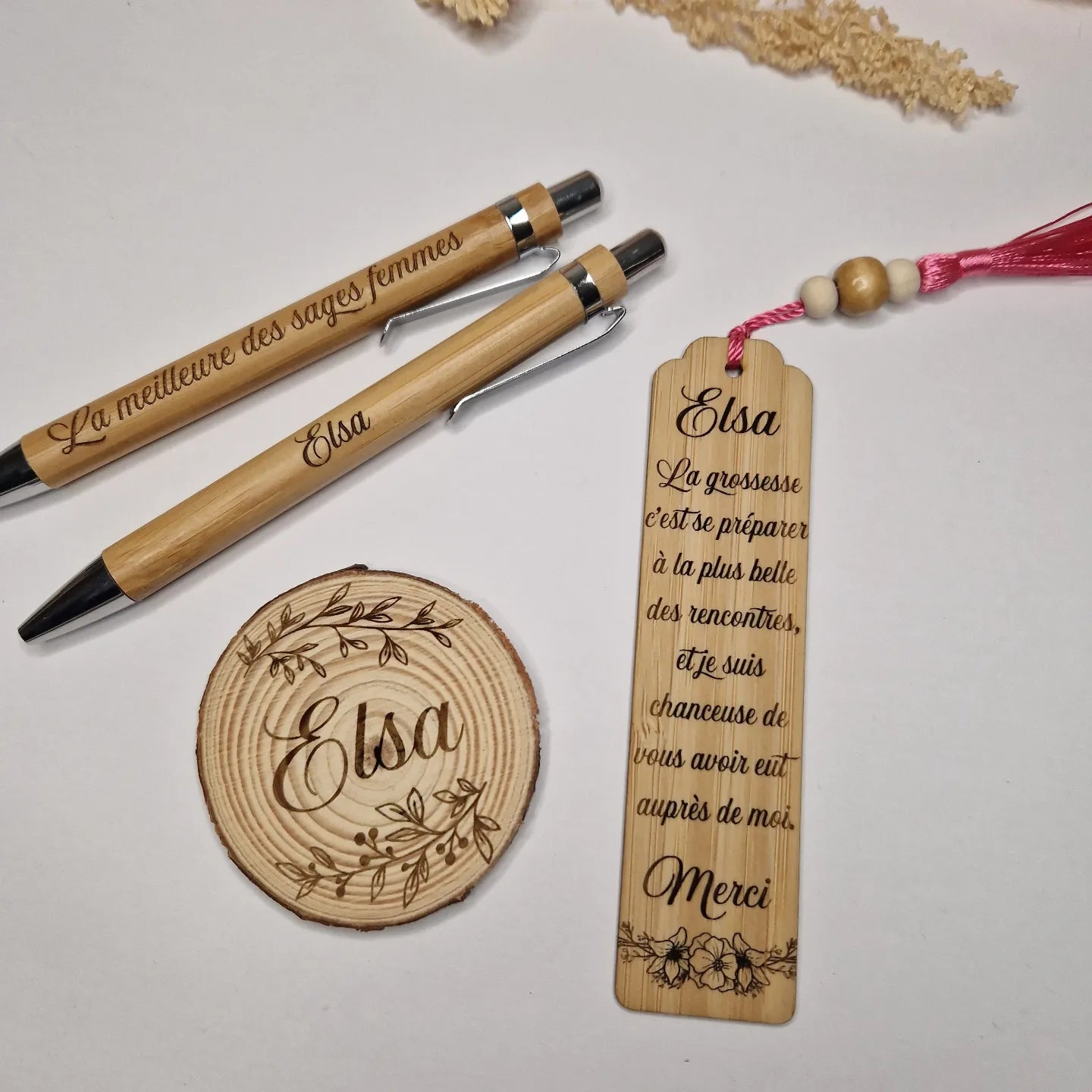 Voici un joli coffret entièrement personnalisable. Il se compose de 2 stylos, un marque page et un rondin de bois gravés.