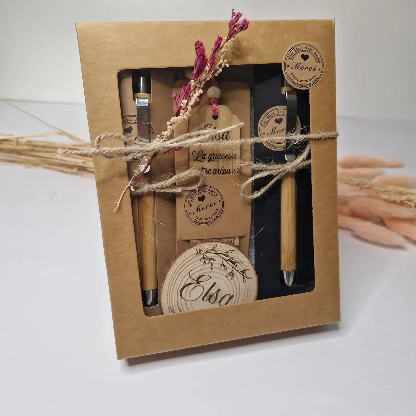 Le coffret est en papier cartonné kraft avec une fenêtre transparente et est agrémenté d’un nœud en corde de jute et de fleurs séchées.