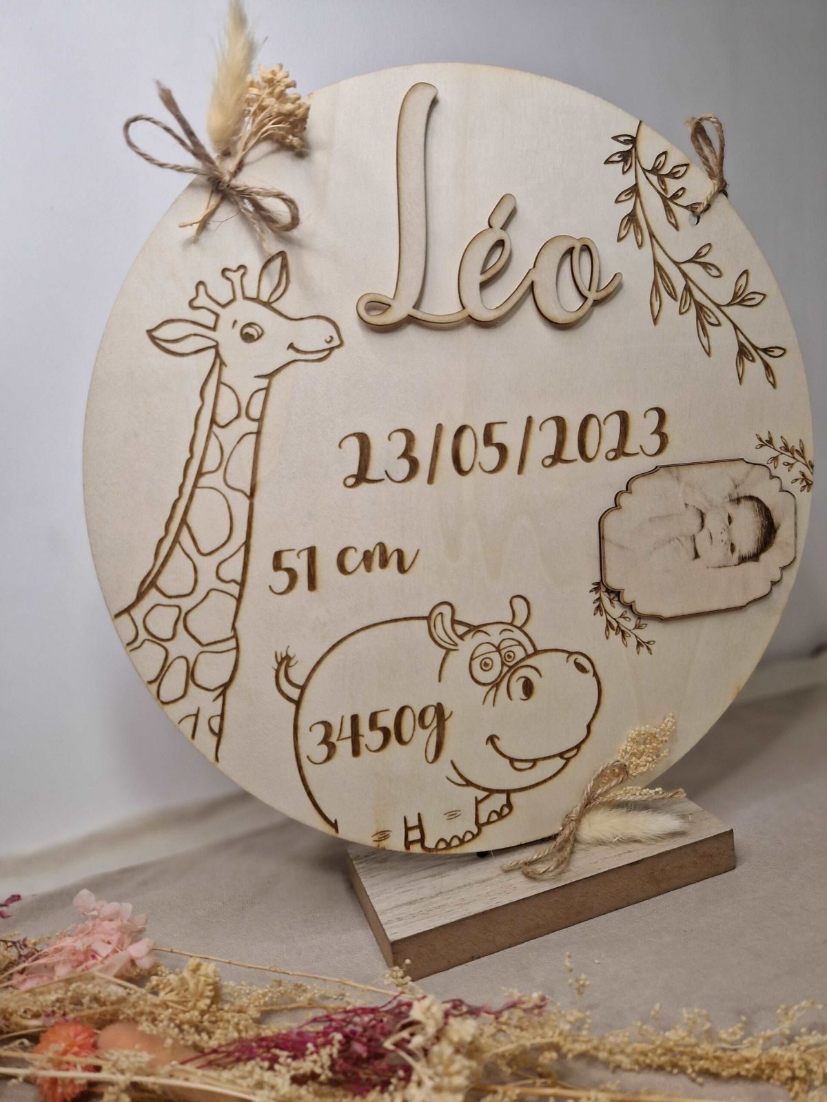 Personnalisation Complète : Le disque peut être entièrement personnalisé avec les détails de la naissance de bébé. Le prénom est découpé au laser et collé sur le disque. La date de naissance, le poids, la taille et même une petite photo de bébé peuvent être gravés avec une précision exceptionnelle. La surface du disque est décorée avec des gravures délicates représentant des éléments du thème souhaité, tels que des animaux exotiques et des motifs floraux inspirés de la nature.